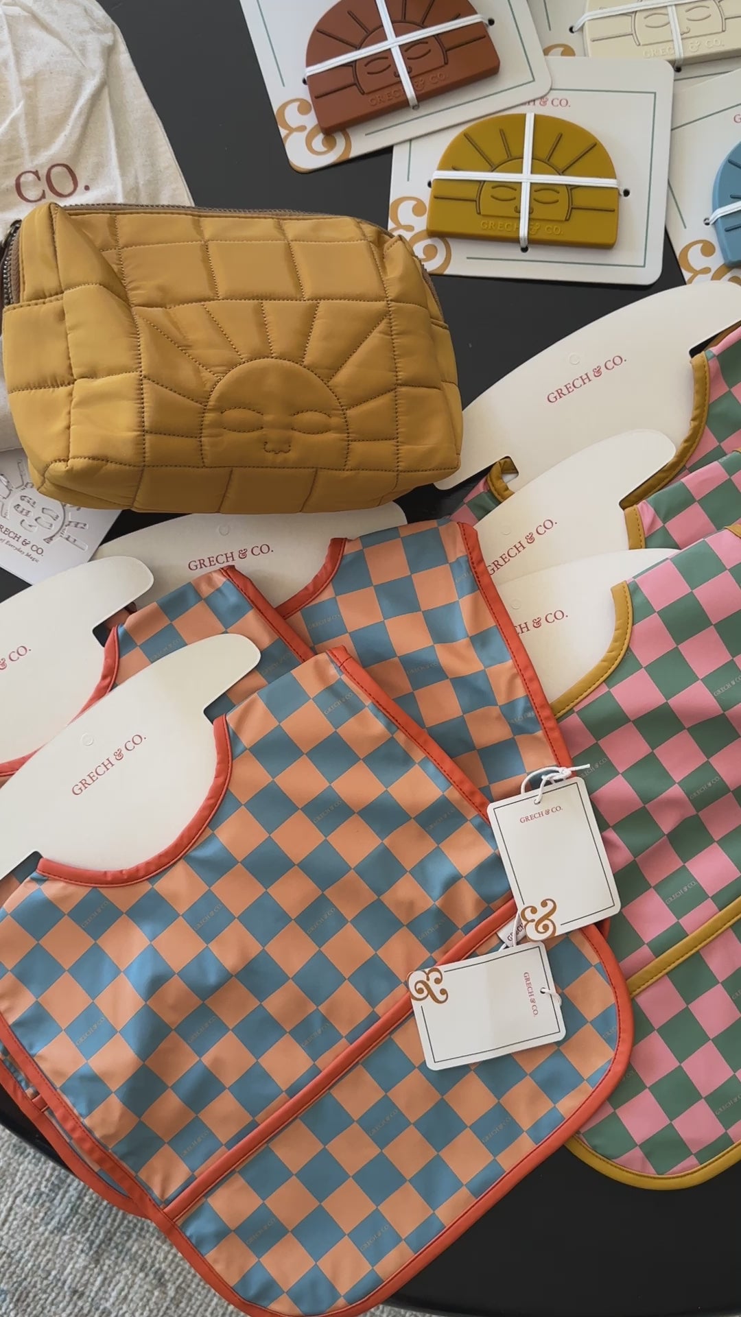 Keep mealtimes cleaner and more fun for all with the Grech & Co. easy to clean and store bib. Featuring a catch-all front bib pocket and water resistant OEKE-TEX material. This piece is a part of the Patterned Retro Collection by GRECH & CO.