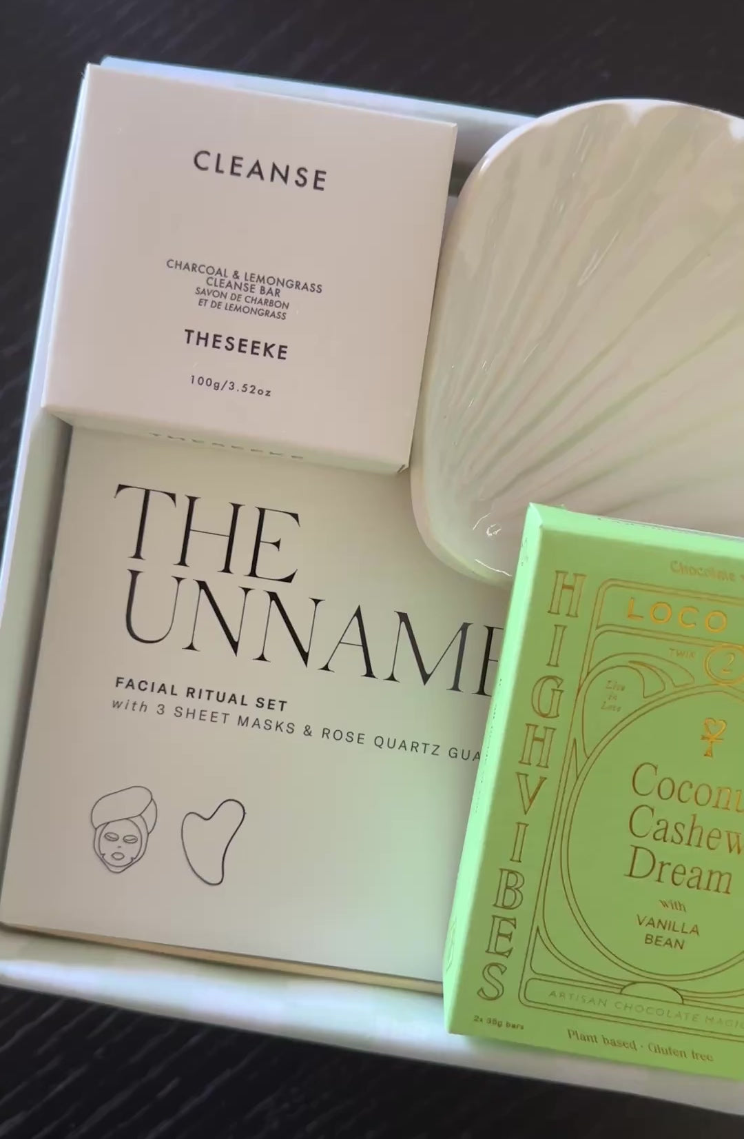 Date night with yourself. Inspired by the bathhouse, this box is the perfect mix of relax and reset. Includes BEST SELLING Australian made vegan sheet masks with Rose Quartz Gua Sha, handmade ceramic vanity shell dish (i.e perfect soap holder) complete with Loco Love Chocolate