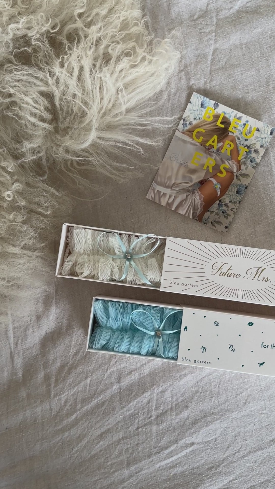 Delicately gathered light blue tulle forms an elastic garter adorned with an ivory satin bow and crystal, placed inside the "for the lovely bride-to-be" white and metallic blue gift box.