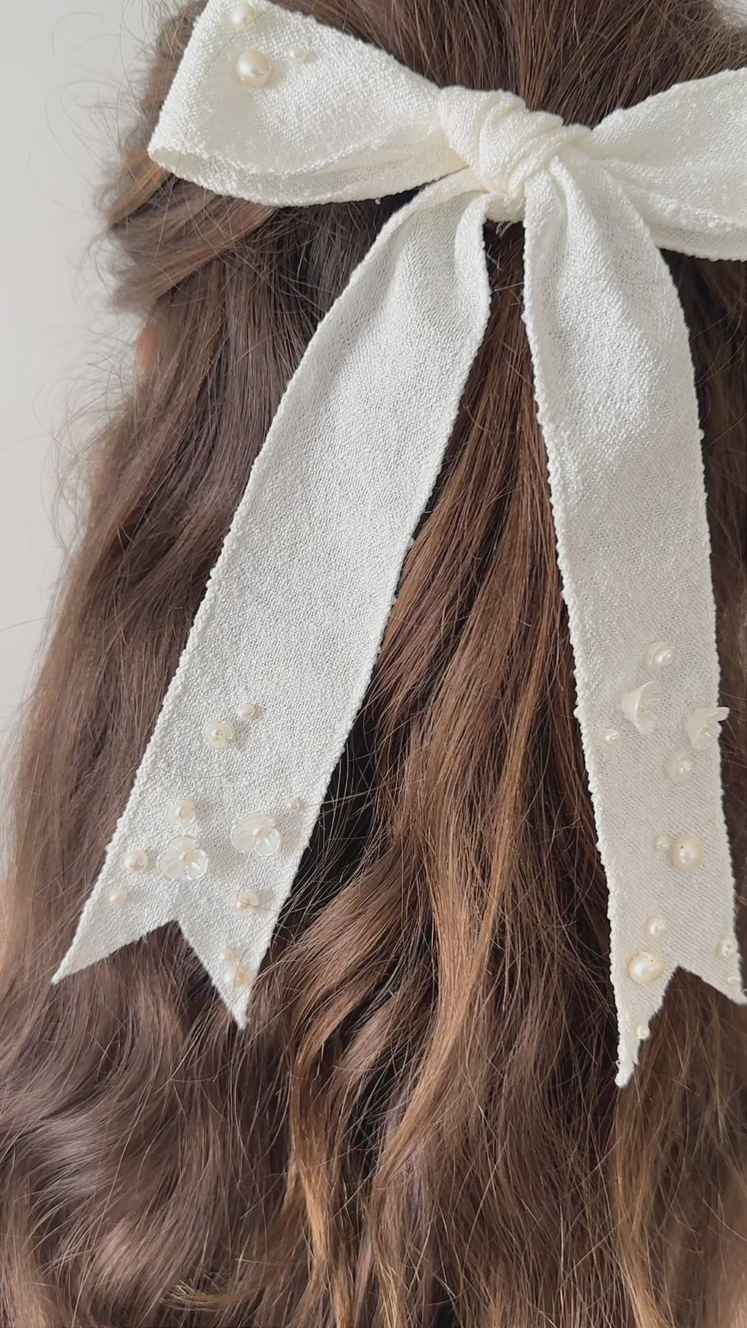 An oversize richly textured ribbon hair bow featuring delicate clusters of freshwater pearls and pearlized ivory flowers. Embellishment is all sewn by hand. Ribbon fabric is a rayon/polyester blend. The ribbon is a ½" (38mm) wide. The bow is 6" wide and 9" long. The hair bow features a French barrette closure which is suitable for all hair types and can be used in a multitude of styles such as a half up-do or tucked above a ponytail or up-do.