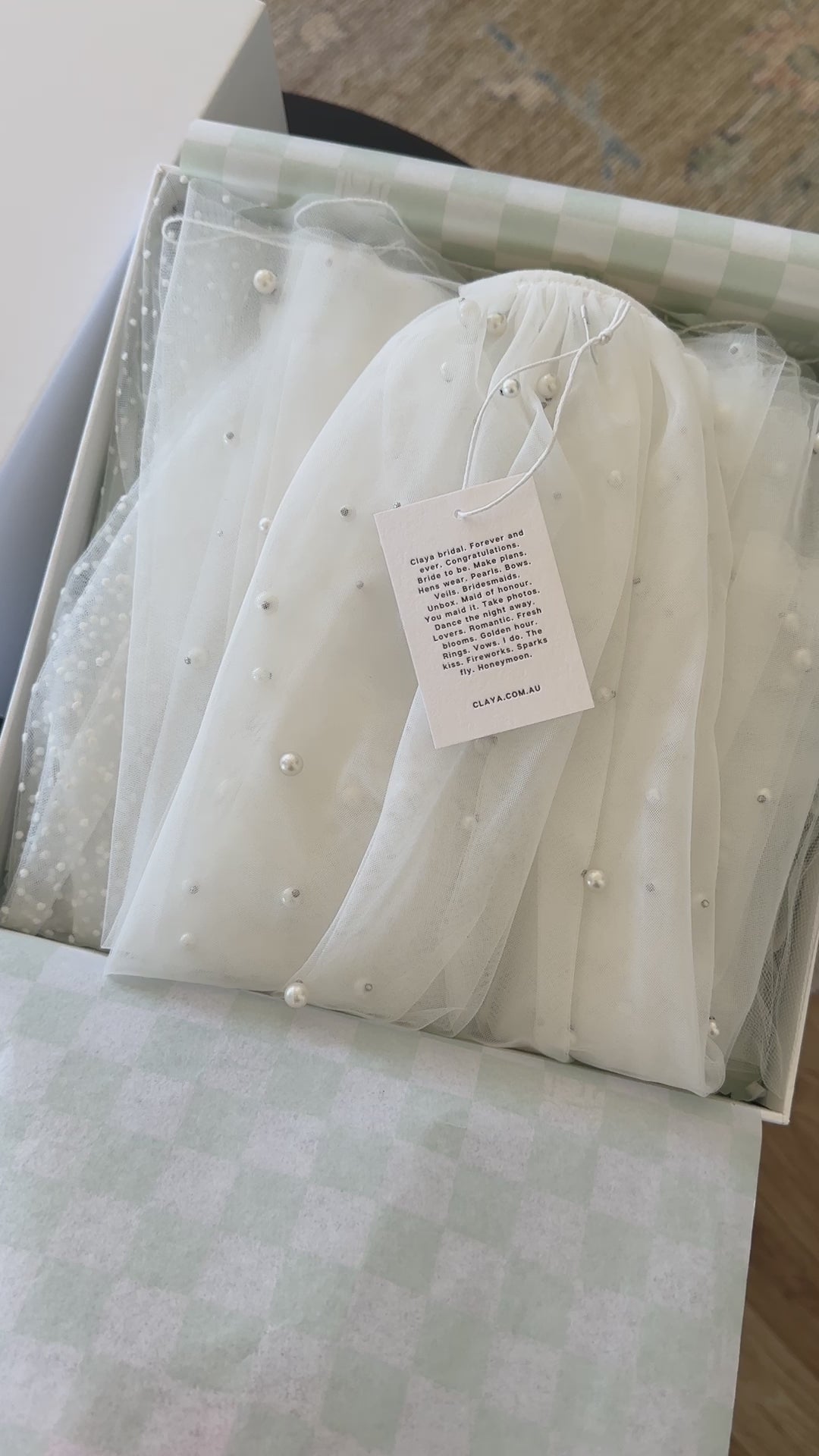 GIFT WORTHY: All veils are carefully packaged in our signature white claya box with a “little something blue” checker tissue and bridal vibes clothing label. A safe place to keep your heirloom piece that can be worn again and again.
