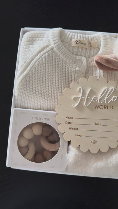 A creamy, soft and beautifully considered newborn gift box designed to welcome baby in the gentlest way. Curated in calming neutral tones, this edit blends practical newborn essentials with meaningful keepsakes to support those first precious days and beyond.