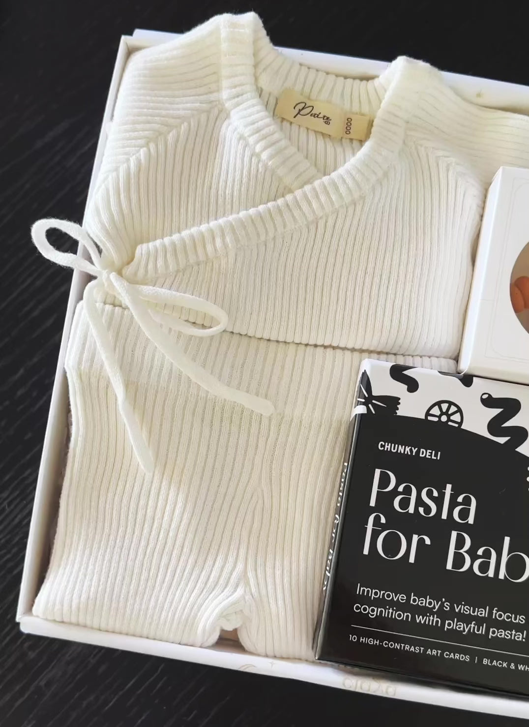 This thoughtfully curated box blends soft dressing, early learning, gentle soothing, and keepsake moments - a modern gift for parents who appreciate beautiful design and meaningful details.